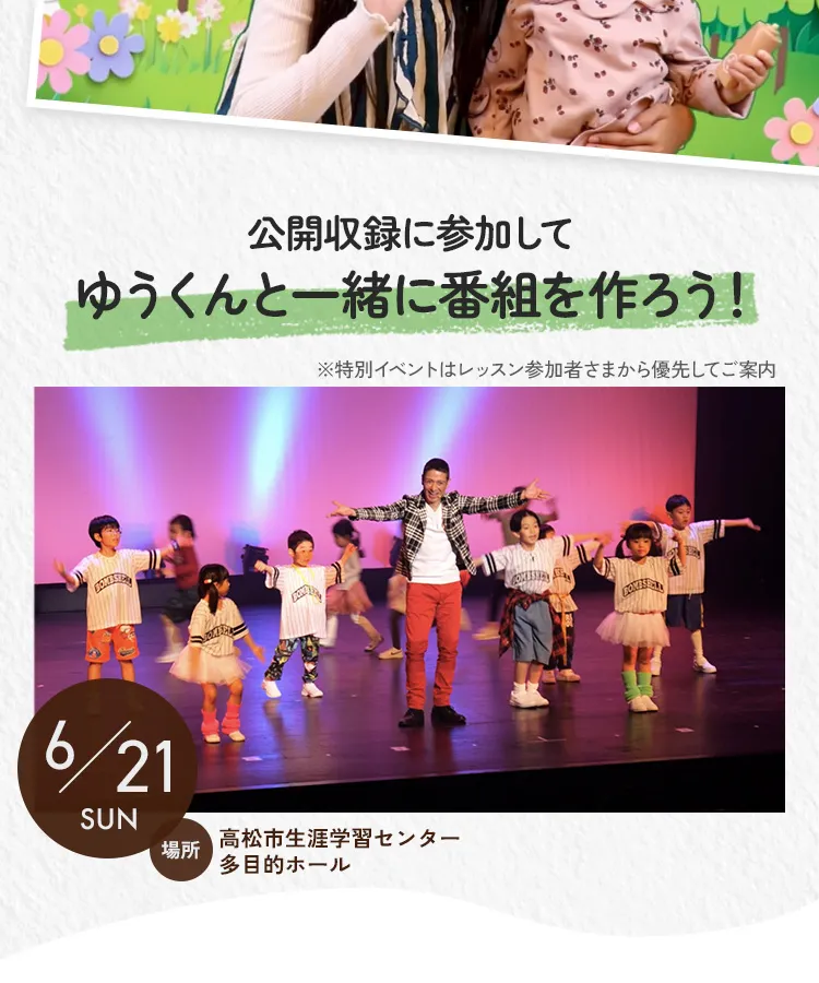 子ども番組づくりの要素を取り入れ、撮影体験やステージ出演など、本物のエンターテインメントの現場を体験。 レッスンだけで終わらず、本物の経験を通して学びを深めていきます。
