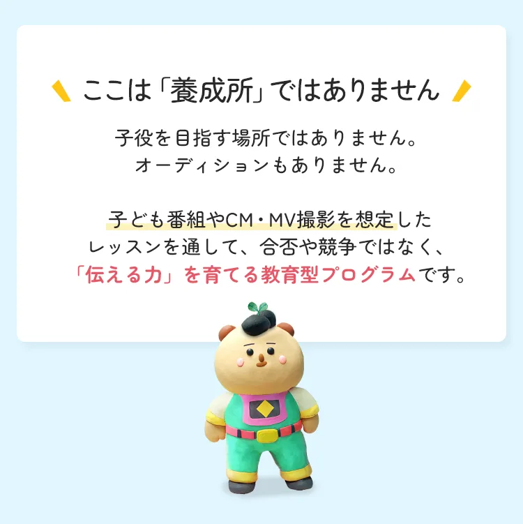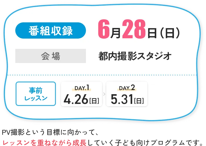 本プロジェクトは、子ども番組づくり/MV撮影等の体験の一環としてレッスン時の撮影を行うことがあります。